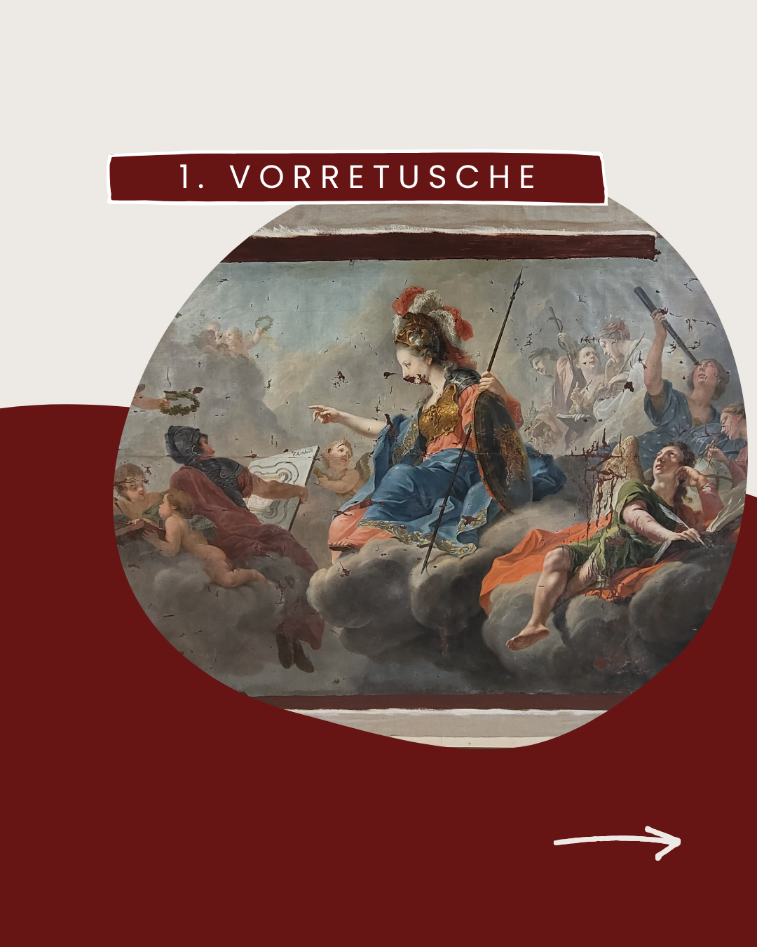 🔹 Vorretusche: In mehreren Phasen werden die Kittungen optisch angeglichen. Diese Vorretusche mit Gouache- und Aquarellfarben schafft die Basis für die spätere Schlussretusche mit Öllasuren und